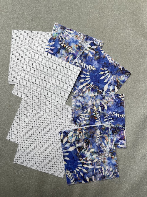 Start med at klippe 2 x 16 firkanter i pap på hver 6 x 6 cm og de 2 x 16 stykker patchwork stof i 8 x 8 cm.