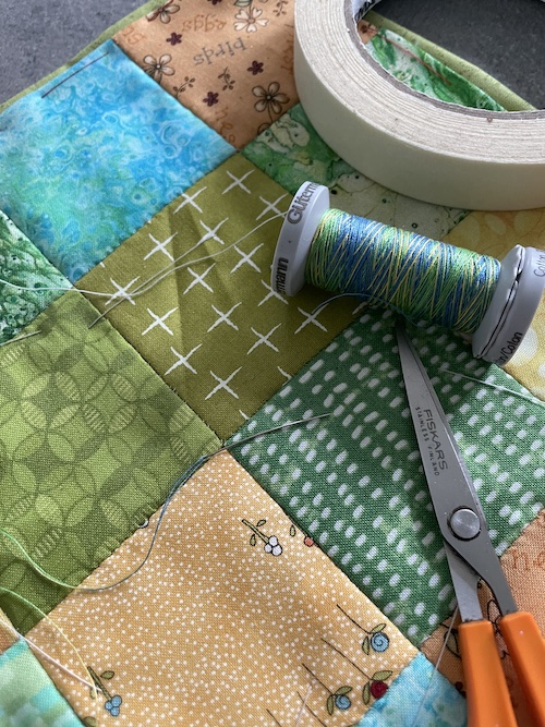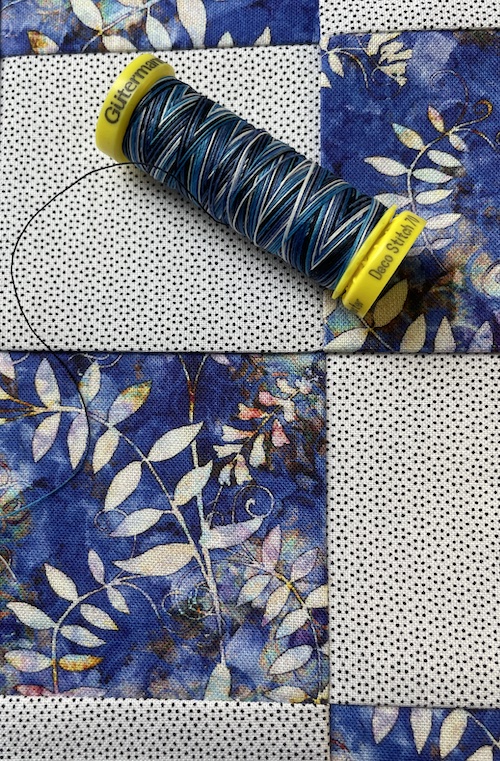 Jeg har valgt en meleret quiltetråd og quilter diagonalt.