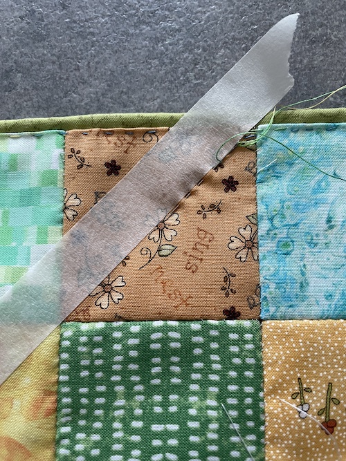 Jeg har quiltet rundt i hele kanten og derefter bruger jeg malertape til at lave diagonale linjer.