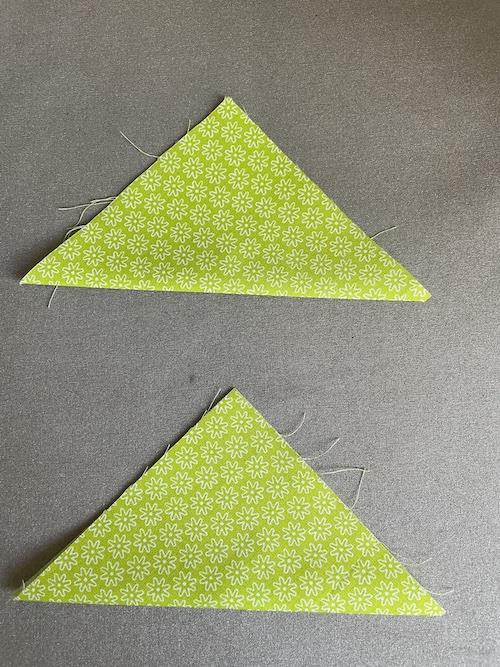 Mine trekanter er skåret på 11 x 11 cm, for sådan var mit stof ( en del fra restekassen)