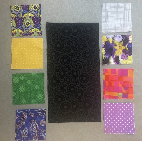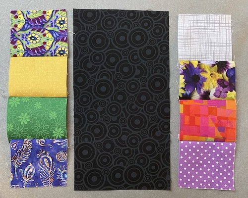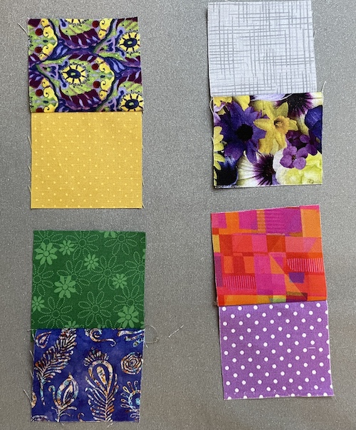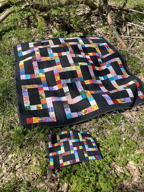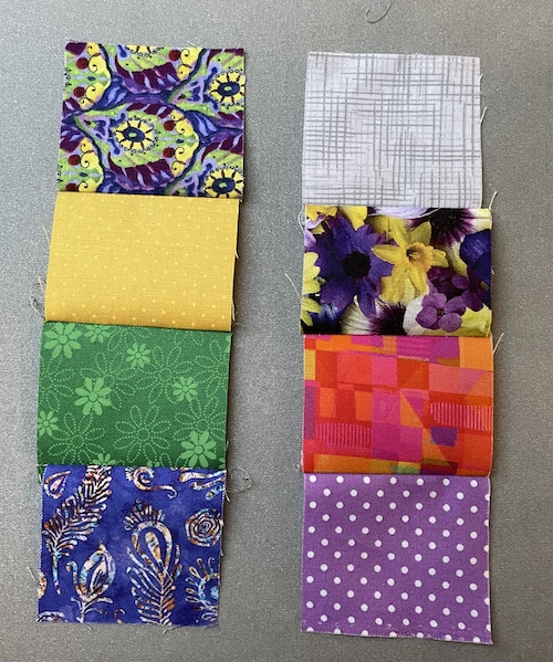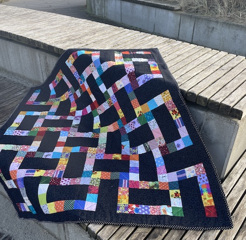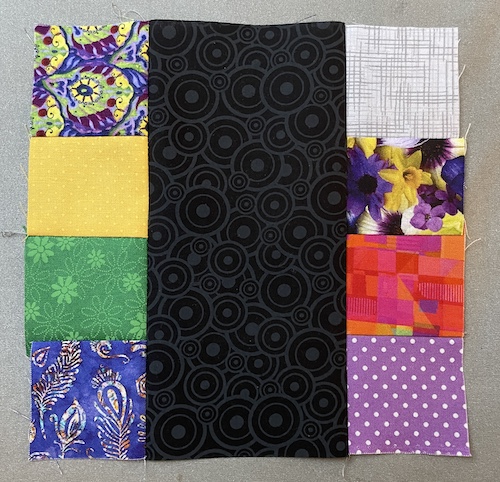 Forside » Gratis DIY og Inspiration » Patchworktæpper med danske bynavne 🇩🇰 » Restetæpper opdelt i de figure de er syet i » Restetæpper syet af 6 cm strimler » 2 stolper med firkanter til Fåborg tæppe