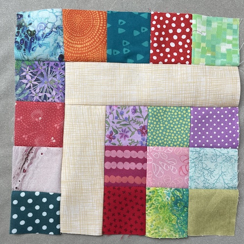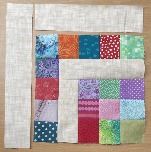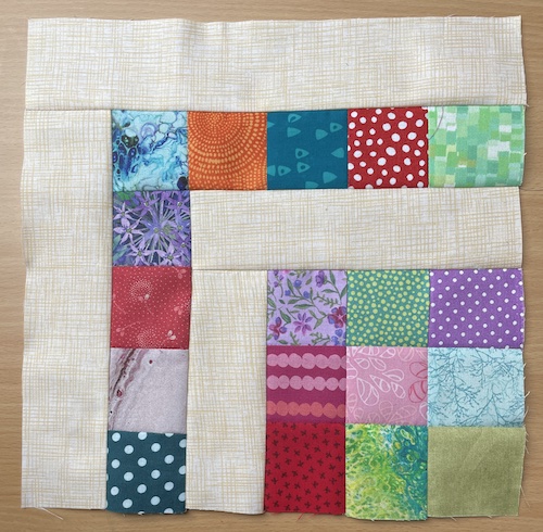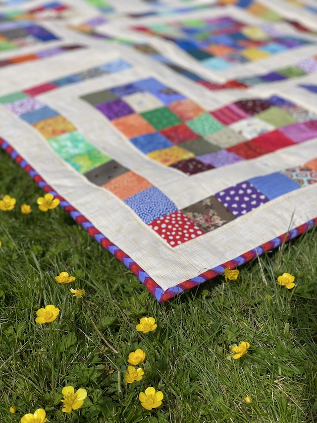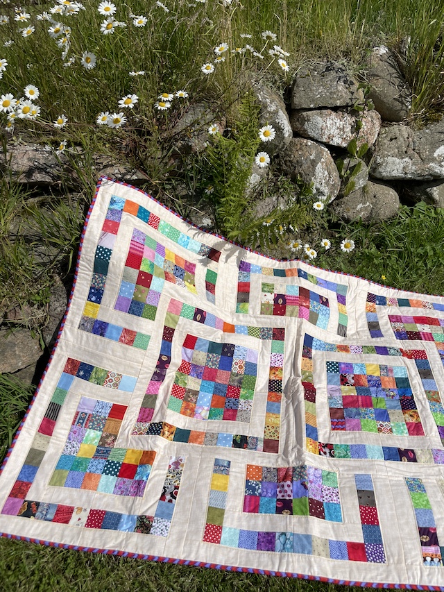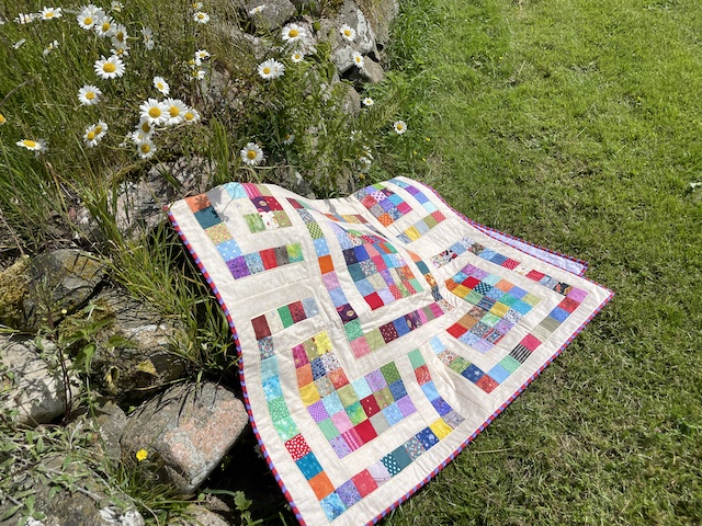 Forside » Gratis DIY og Inspiration » Patchworktæpper med danske bynavne 🇩🇰 » Restetæpper opdelt i de figure de er syet i » Restetæpper syet af 6 cm strimler » 2D restetæppet hedder Søndersø tæppet