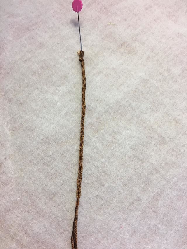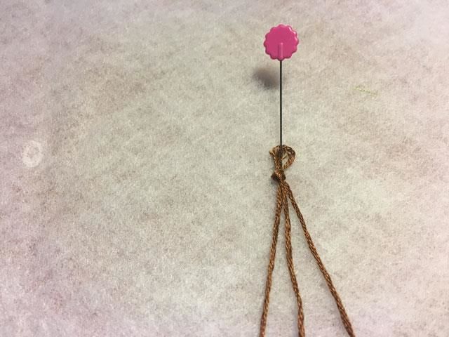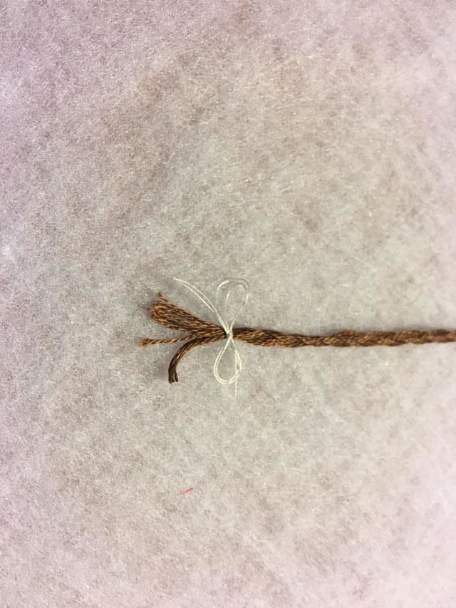 Men start med at tage 3 stykker 6 trådet DMC garn på ca 15 cm.