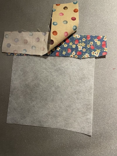 L 11 i ca 14 x 14 cm og start med at lægge stoffer udover L11, de 2 første stykker ret mod ret.