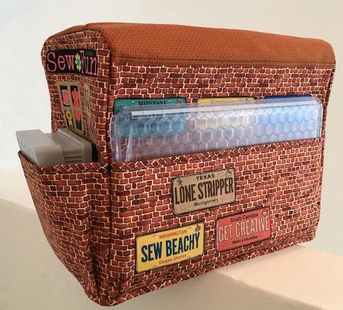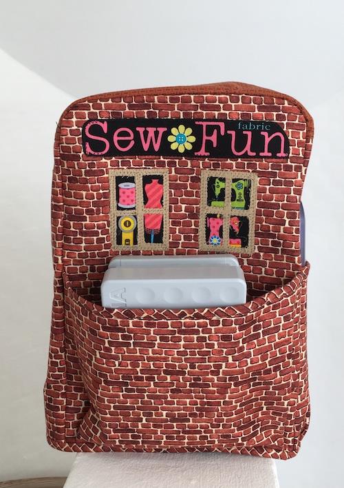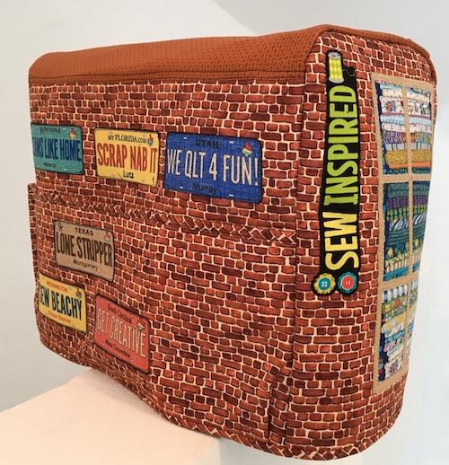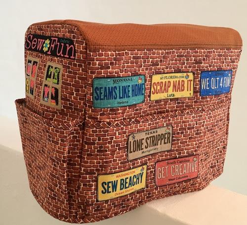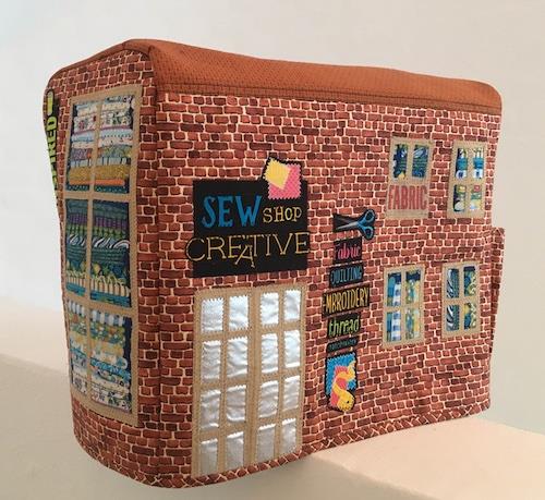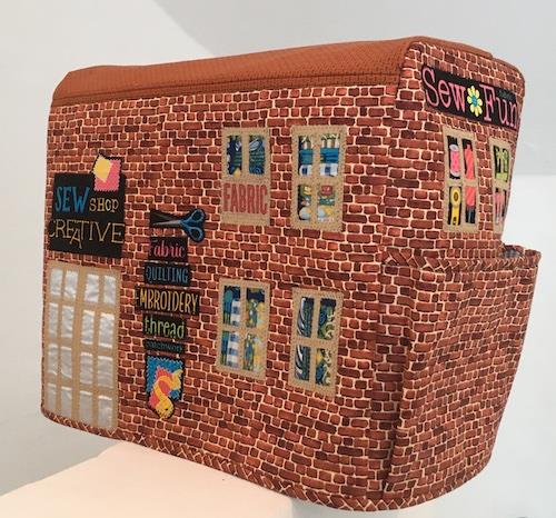 Min Bernina B215 er leveret med en kedelig sort støvhætte, som jeg sjældent bruger. Derfor har jeg syet et hus som støvhætte og jeg tænker at det i fremtiden bliver meget sjovere at rydde op efter mig selv i syværelset, når jeg kan sætte hus på min symaskine. Selvfølgelig måtte huset blive til en kreativ stofbutik. Støvhætten består af to gavle og et langt stykke, der udgør både forside, tag og bagside. Der er blevet plads til både forlængerbord og trykfod i de med-indsyede/påsatte lommer. Det er patchworkstoffer fra gemmerne applikeret på en lidt  grov og stribet hør-canvas inderst og med vlies imellem. Der var nøjagtig nok murstensstof til at jeg kunne trække skråbånd til kantning på lommerne og forneden på huset.