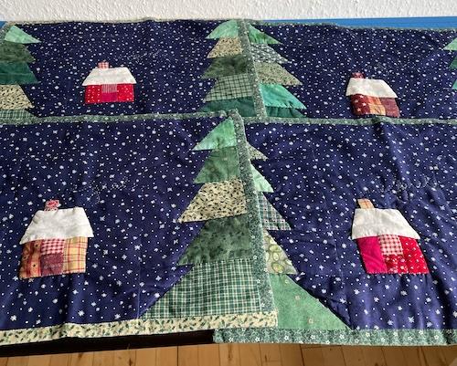 Her er 4 dækkeservietter efter Hanne Wellendorphs julepatchwork. Håndsyet og håndquiltet.