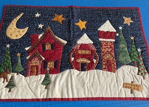 Dette tæppe har jeg applikeret i hånden og håndquiltet. Det er syet som en bom fra quilt my design. Her er 4 dækkeservietter efter Hanne Wellendorphs julepatchwork. Håndsyet og håndquiltet. Q Og sidst men ikke mindst Welcome to the north pole efter bogen af samme navn. Håndsyet og håndquiltet.  Med venlig Chila Westergaard