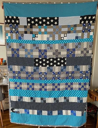 Mit bud på resteræs tæppet blev dette stjernetæppe - jeg har freestylet mønstret for at forlænge tæppet, men er ganske godt tilfreds med resultatet 🩵💙