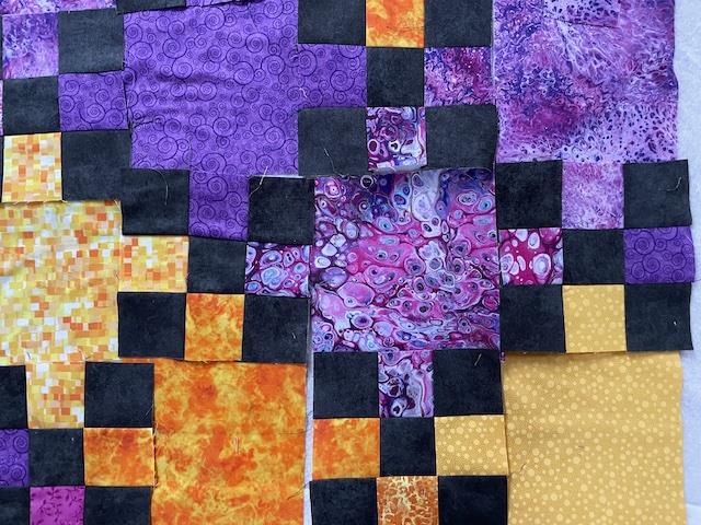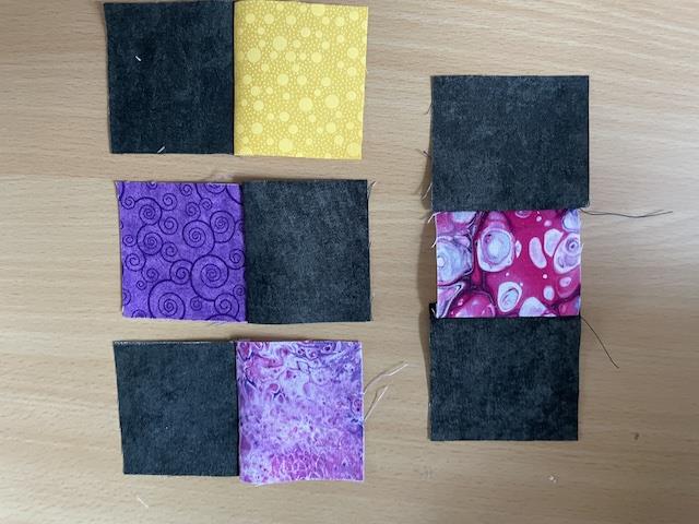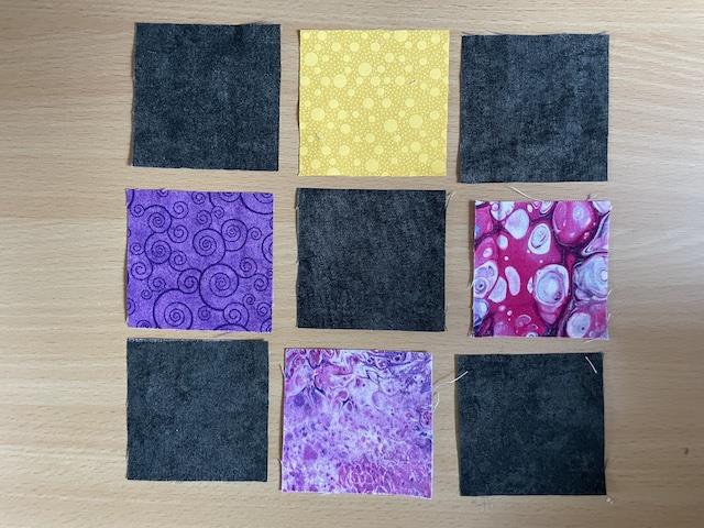 Når blokken/Tæppet er lagt op i rigtig farver/system syes de 9 små firkanter samme.