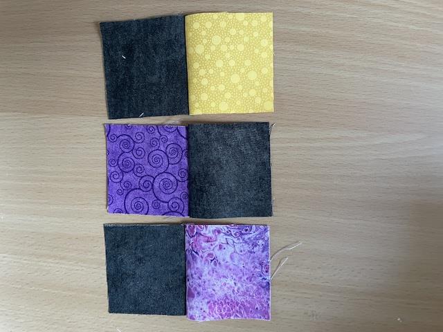 Så af hver kontrast farve skal du bruge 4 små firkanter på hver 6 x 6 cm og en stor firkant på 15 x 15 cm.