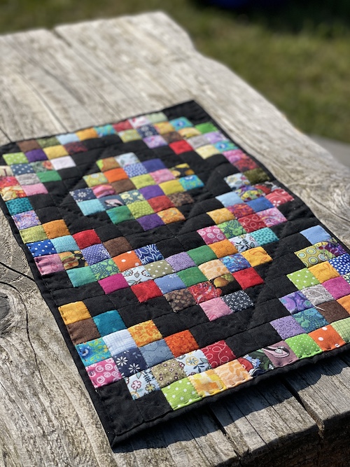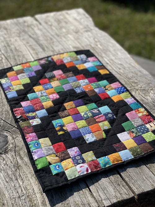 Forside » Gratis DIY og Inspiration » Patchworktæpper med danske bynavne 🇩🇰 » Dækkeservietter mm i stofrester efter bynavne tæpper » Aars tæppet i mini firkanter - håndsyet