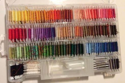 På det andet billede kan du se, hvordan dit broderigarn kan opbevares flot og organiseret i æsken. Æsken er ikke kun funktionel, men også en smuk tilføjelse til dit arbejdsområde, da den har en enkel og elegant mælkehvid farve, der passer godt ind i enhver kreativ arbejdsplads.