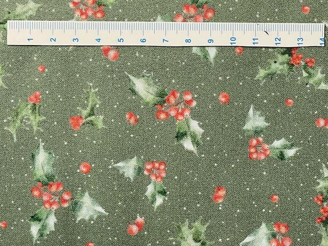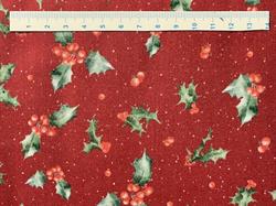 og har et flot klassisk mønster med grønne kristjørne og røde bær, jævnt fordelt på stoffet.