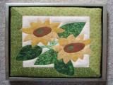 Dette flotte patchwork Billed med Solsikker, kan sættes i en svæverammen (30x30 cm), eller bruges som en taske eller pude. Blomsten er applikeret på, men der er papskabeloner med så den kan syes både i hånden og på maskine. Udførlig sy vejledning medfølger.