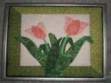 Dette flotte patchwork Billed med Tulipan, kan sættes i en svæverammen (30x30 cm), eller bruges som en taske eller pude. Blomsten er applikeret på, men der er papskabeloner med så den kan syes både i hånden og på maskine. Udførlig sy vejledning medfølger.