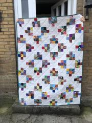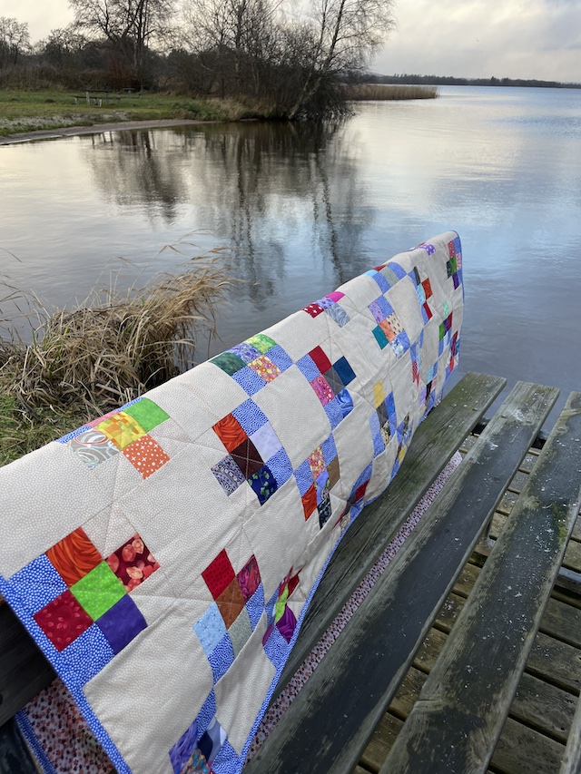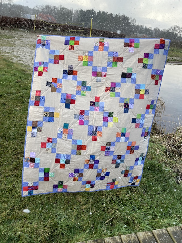 Har quiltet diagonalt med en meleret quiltetråd rundt i firkanter med de små firkanter.