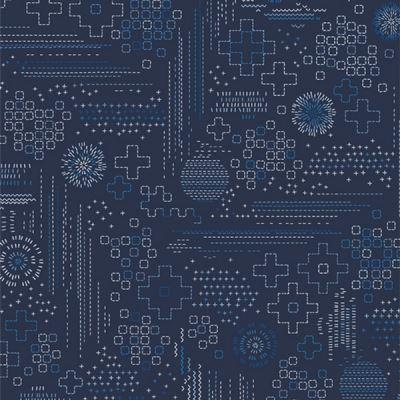 Dette flotte blå patchwork stof har et smukt "streg tegnet" mønster i blå farver.
