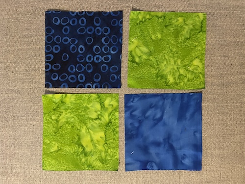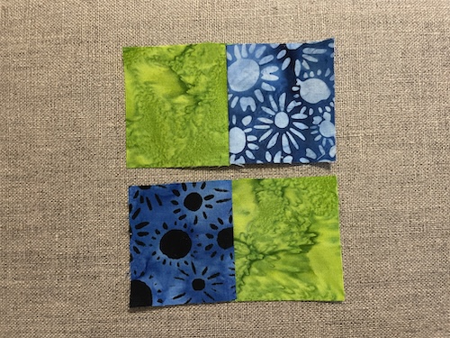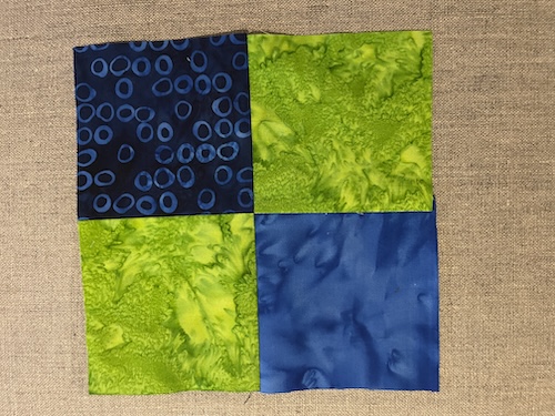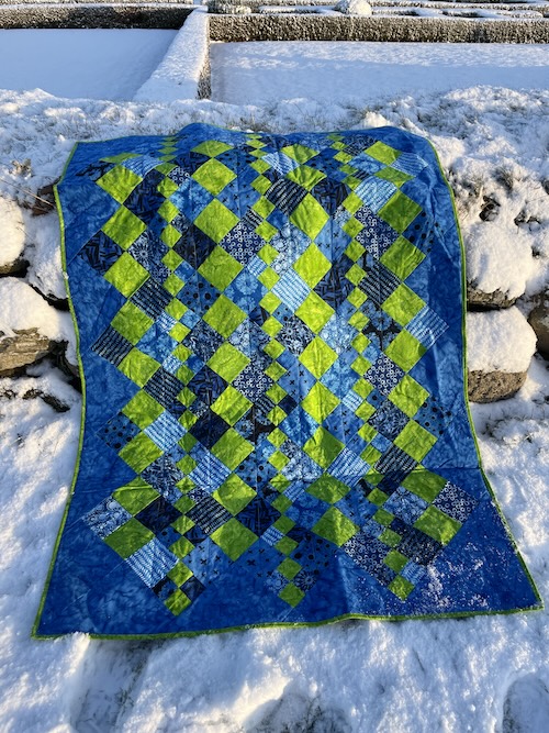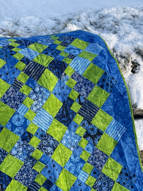Forside » Gratis DIY og Inspiration » Patchworktæpper med danske bynavne 🇩🇰 » Restetæpper opdelt i de figure de er syet i » Restetæpper syet af 3 figurer » Blokken på højkant i blå og grøn farver- Tappenøje tæppet