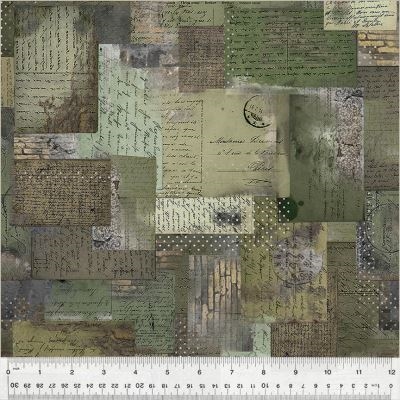Boho Chick patchworkstof - Grøn-grå, er et meget smukt 100% bomuld patchwork stof der er 110 cm bred. Denne meget flotte serie af patchwork stof har, et meget smukt "patchwork mønster" på en blanding af grå og grønne farver som bundstof med masser af tekst i alle retninger.