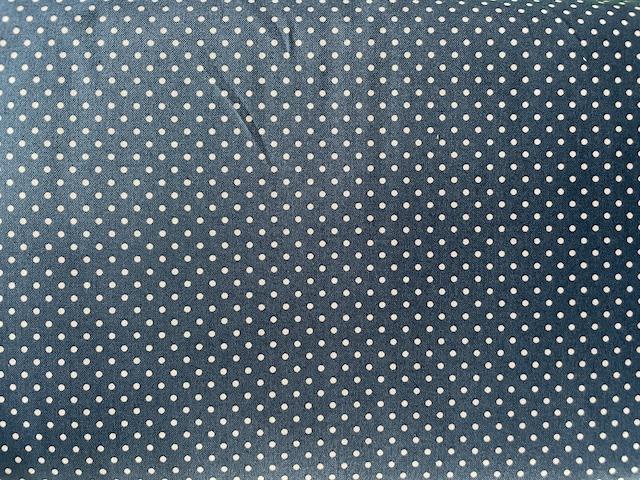 Er et flot Demin blå  bred bomuldsstof med små hvide prikker i rækker.
