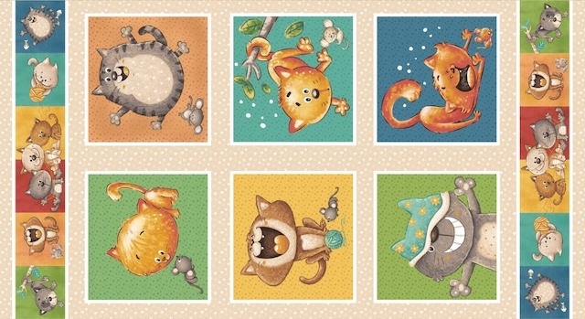 Dette meget smukke panel patchwork stof med legesyge katte med mus og garn.