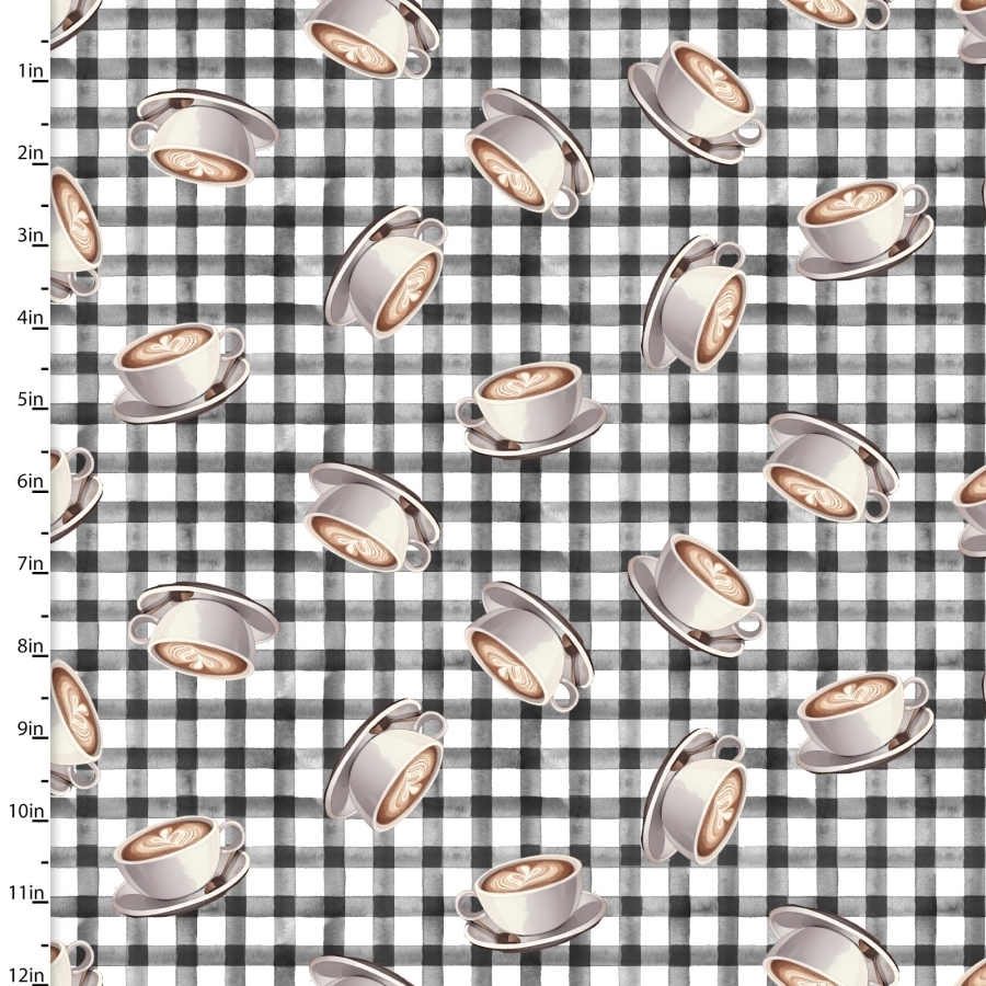 Coffee break patchworkstof med kopper, er et meget smukt 100% bomuld patchwork stof der er 110 cm bred. Denne meget flotte kaffe serie af patchwork stof har ternet bundfarve med masser af kaffe kopper på i alle retninger.