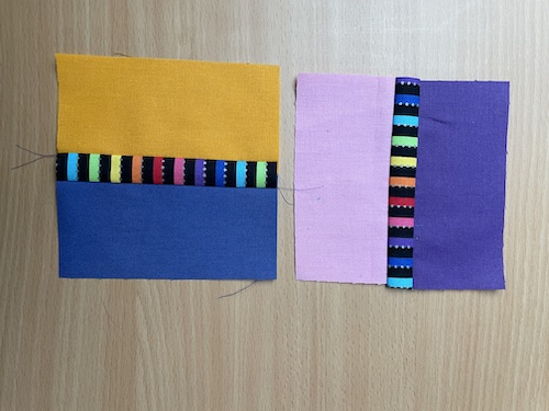 Forside » Gratis DIY og Inspiration » Patchworktæpper med danske bynavne 🇩🇰 » Restetæpper opdelt i de figure de er syet i » Restetæpper syet af 2 figurer » Delte firkanter med strimler bliver Haslev tæppet