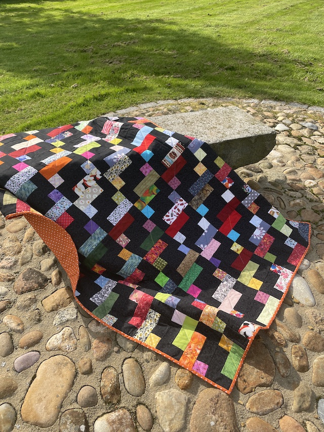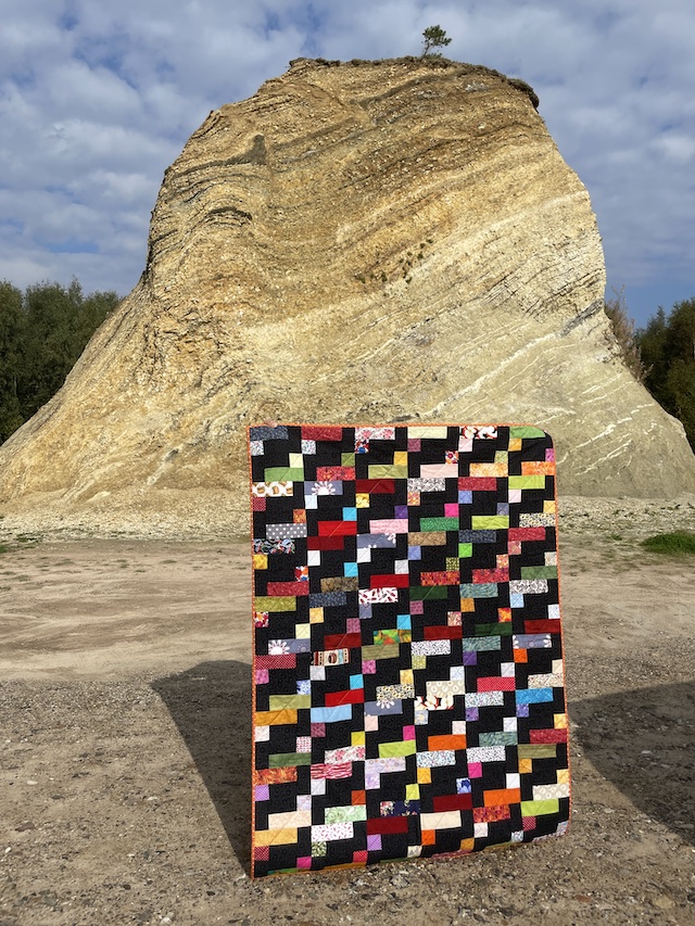 Har quiltet diagonalt med en meleret quiltetråd diagonalt i reste farverne.