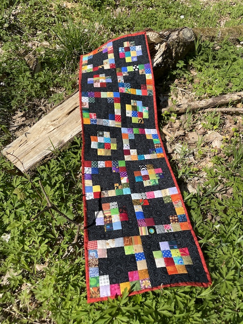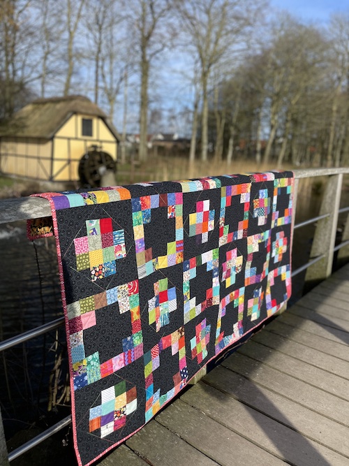 Det er syet efter denne gratis DIY på det smukke og modsatte blokke restetæppe som hedder Ebberup.