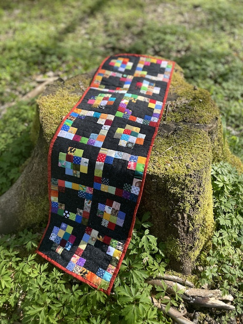 Forside » Gratis DIY og Inspiration » Patchworktæpper med danske bynavne 🇩🇰 » Dækkeservietter mm i stofrester efter bynavne tæpper » Ebberup løber her håndsyet over pap