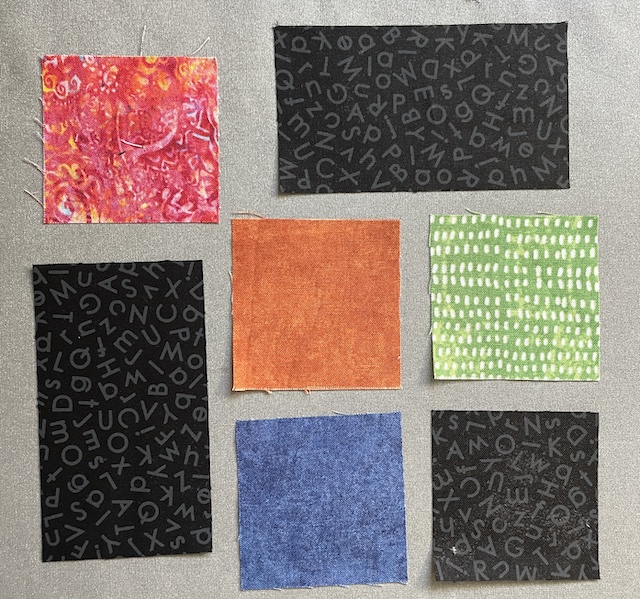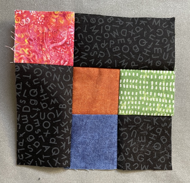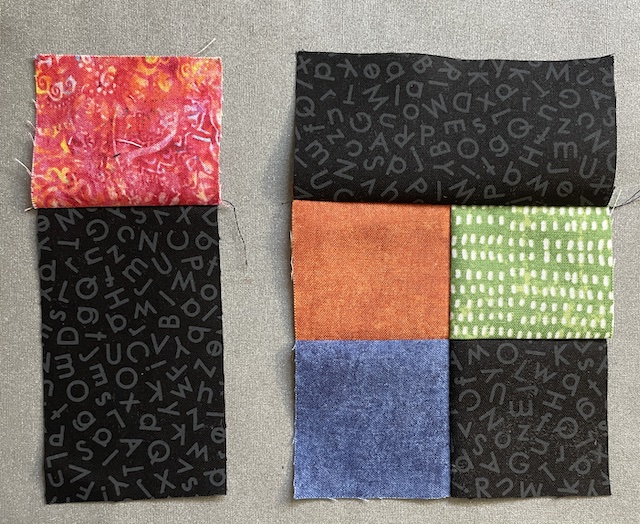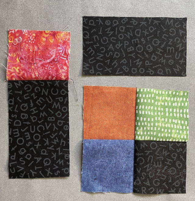 Start med at sy de 4 firkanter sammen og sy den sidste reste farvet firkant på den ene rektangel.