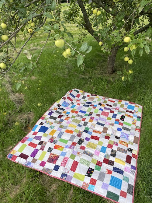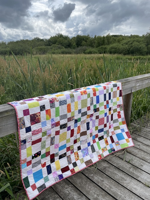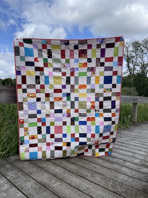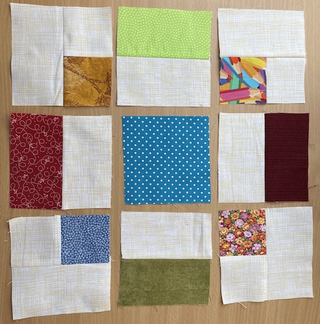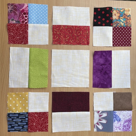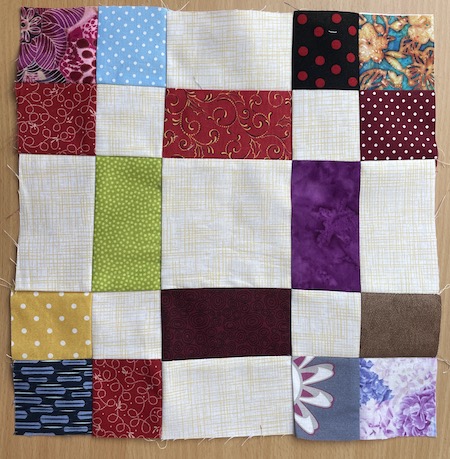 Forside » Gratis DIY og Inspiration » Patchworktæpper med danske bynavne 🇩🇰 » Restetæpper opdelt i de figure de er syet i » Restetæpper syet af 6 cm strimler » Ens blokke men modsat til Brande restetæppe