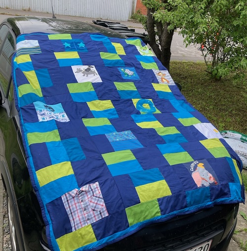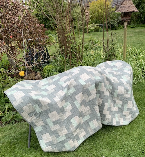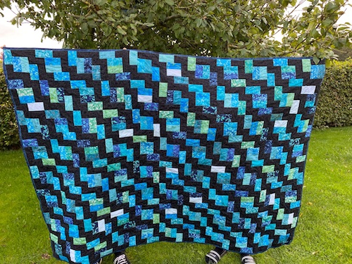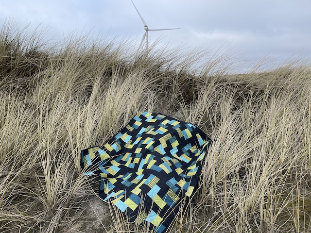 med en meleret blå/grøn quiltetråd, lidt skrå på blokken.