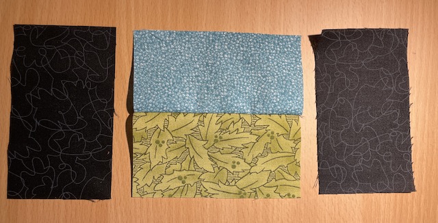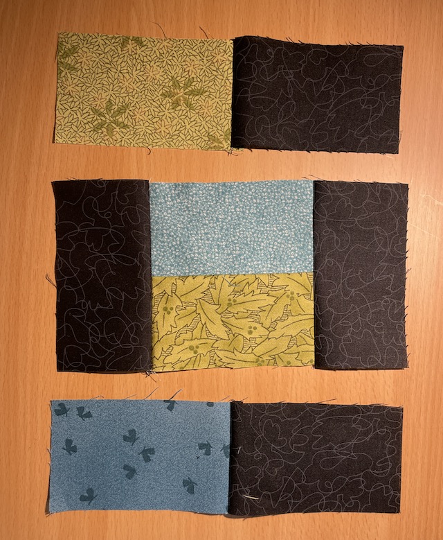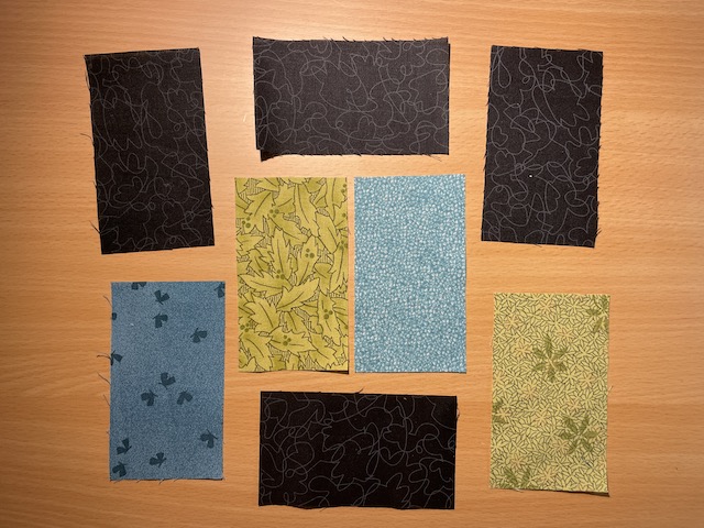 Til en blok er der brugt 4 sorte rektangler i bundfarven og 4 farvet - her 2 blå og 2 grønne.