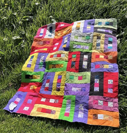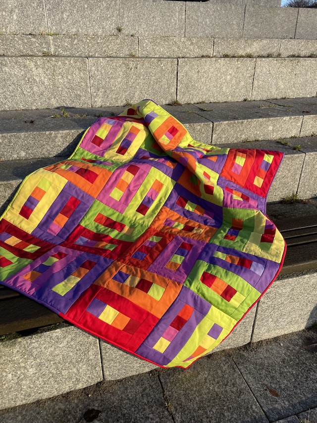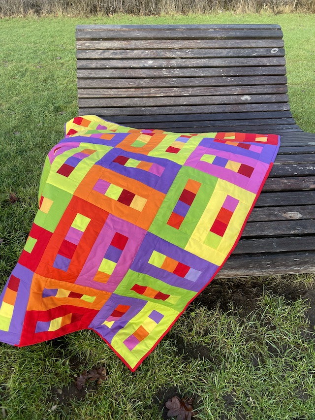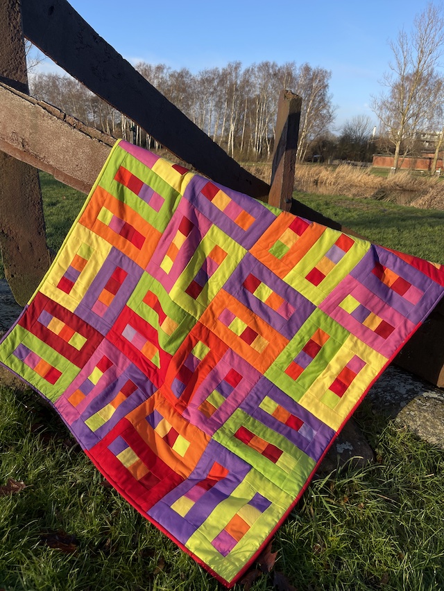 Forside » Gratis DIY og Inspiration » Patchworktæpper med danske bynavne 🇩🇰 » Restetæpper opdelt i de figure de er syet i » Restetæpper syet af 6 cm strimler » Ensfarvede firkanter i rammer. Tønder restetæppe