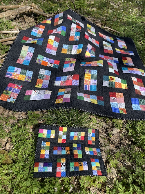 I Svendborg tæppet er papskabeloner syet med reste farver på 2 x 2 cm og de sorte stolper på 2 x 8 cm.