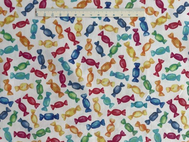 Er et flot lyst bred bomuldsstof med masser af farverige blocher der er pakket ind
