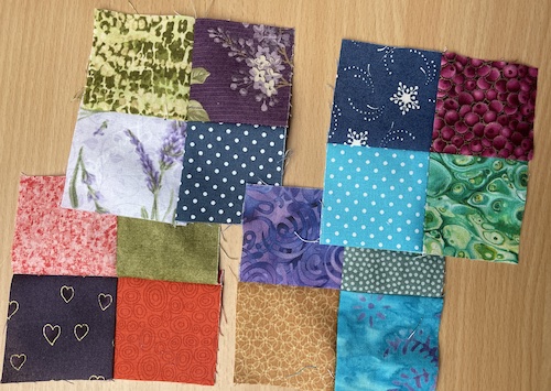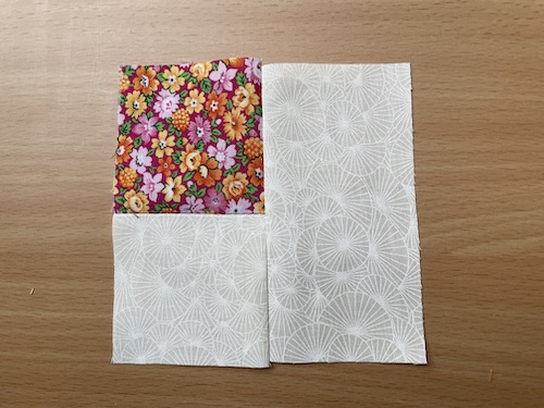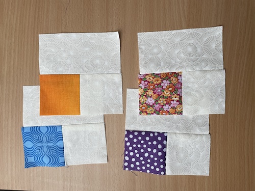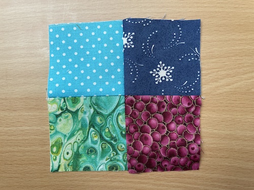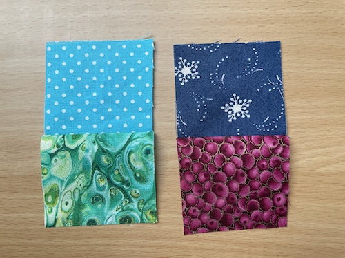 Derefter syr du 4 firkanter i reste farven, på hver 6 x 6 cm.