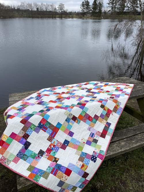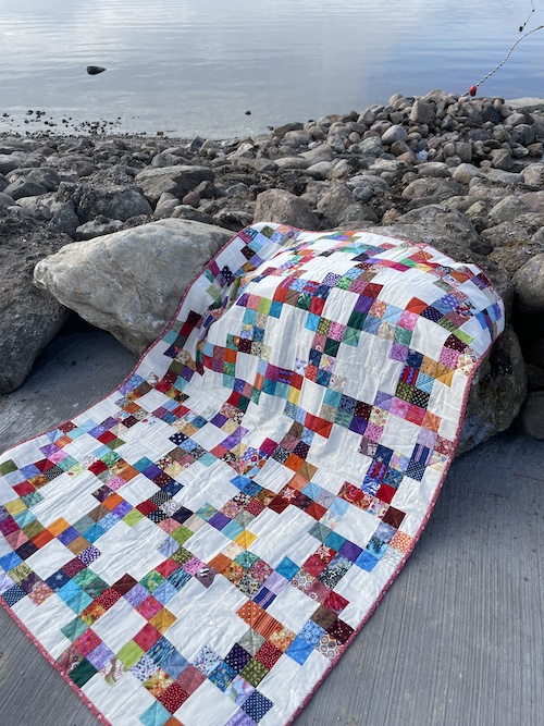 Har quiltet diagonalt med en meleret quiltetråd i firkanter igennem alle de mange flotte restefarver.