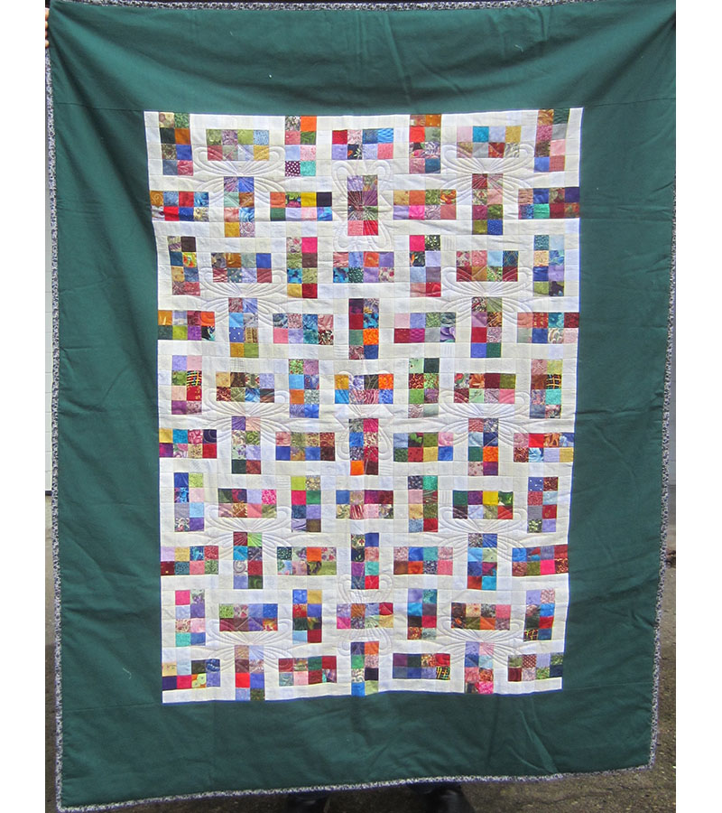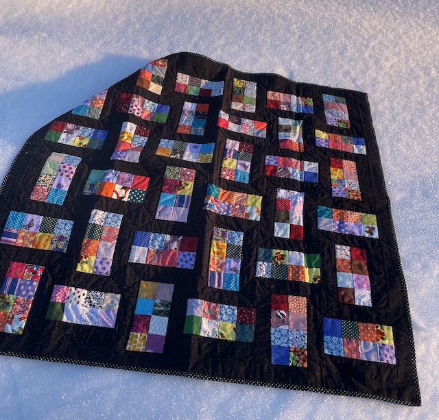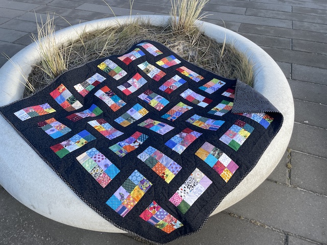 Har quiltet diagonalt med en meleret quiltetråd rundt i firkanter tæt på den sorte bundfarve.