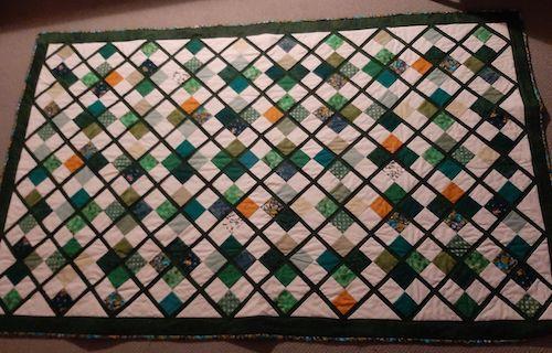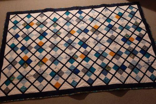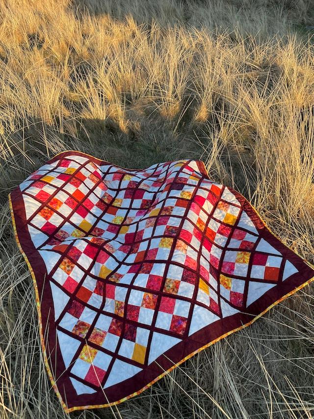 Når tæppet er samlet med bagside og mellemfoer quilter jeg tæppet som afslutter med en 6 cm lukkekant.