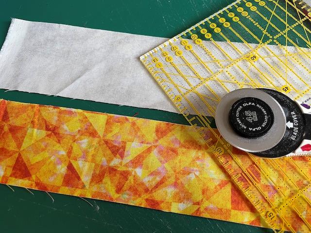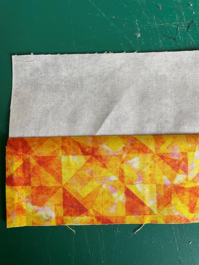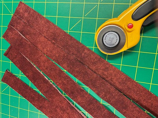 Da dette tæppe er syet på skrå samler jeg dem i rækker med de mørkerøde strimler imellem alle blokke og trekanter.