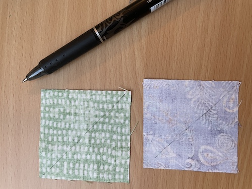 På vrangsiden af de to små firkanter tegner du nu en diagonal linje som på billede.