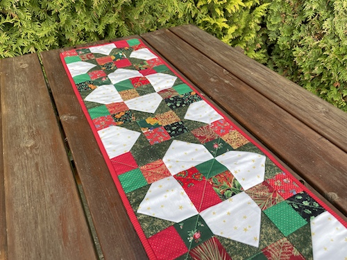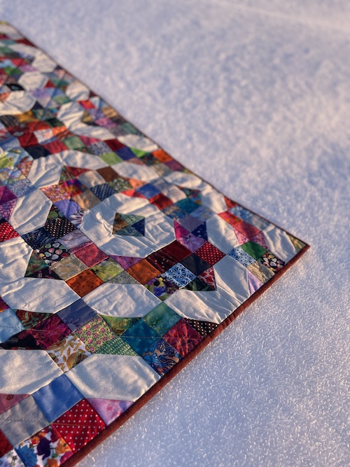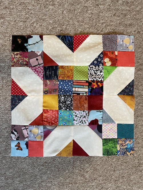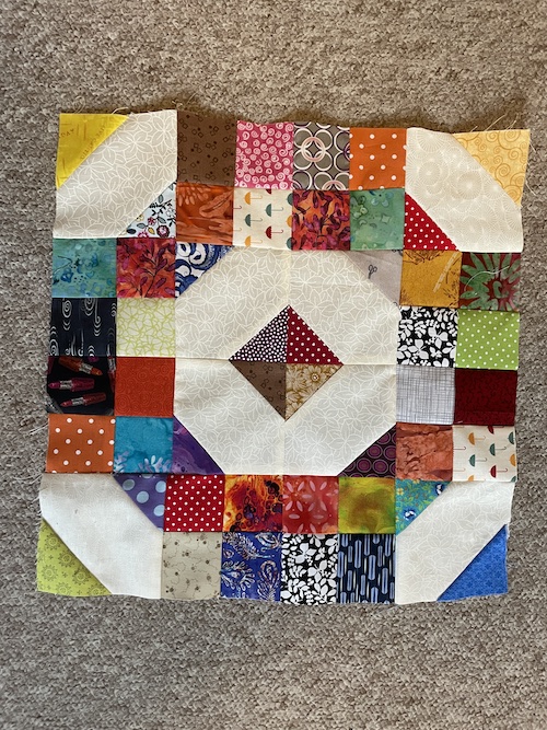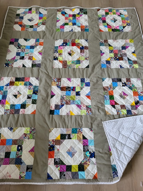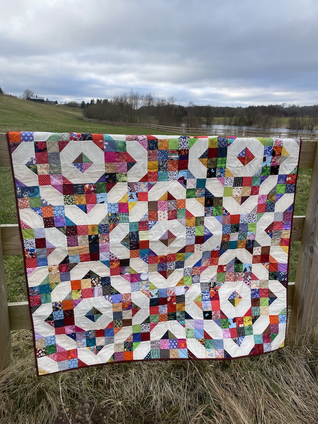 Forside » Gratis DIY og Inspiration » Patchworktæpper med danske bynavne 🇩🇰 » Restetæpper opdelt i de figure de er syet i » Restetæpper syet af kun firkanter » Firkanter og trekanter giver smukt Ringe restetæppe