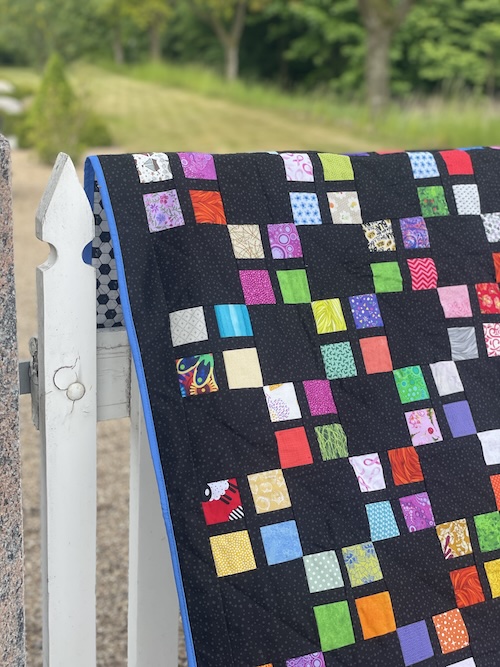 Har quiltet diagonalt med en meleret quiltetråd igennem alle de sort sorte firkanter.