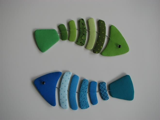 Når først skabelonerne er klippet ud, kan du sy fiskene igen og igen, og lave en hel stim af farverige fisk til pynt eller leg.