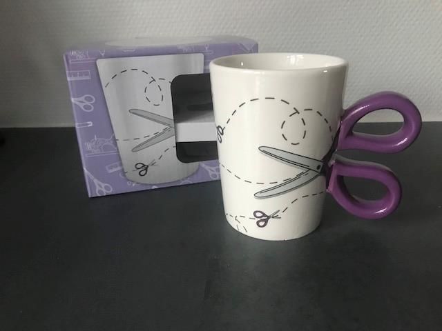 Dette lyse krus har en lilla saks hvor håndtaget af saksen er håndtaget.