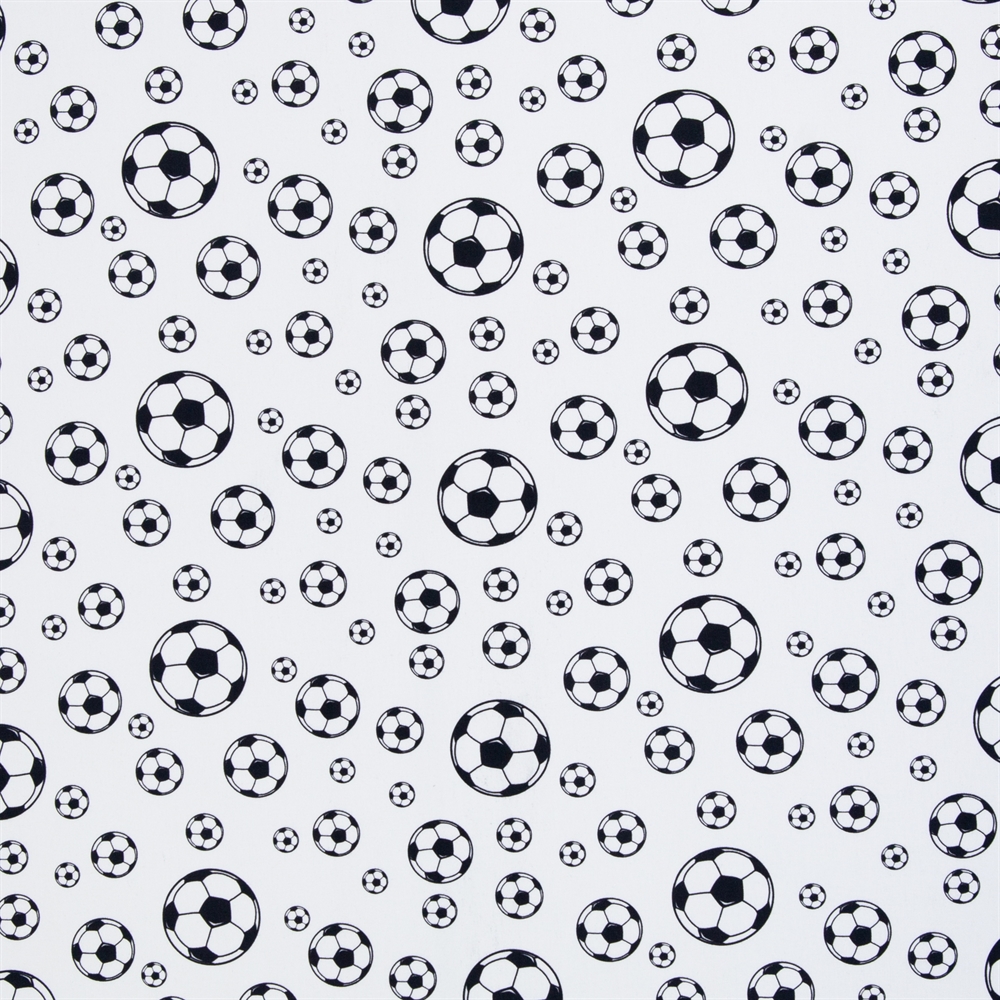 Er et flot bred lys bomuldsstof med sorte fodbolde i forskellige størrelser..