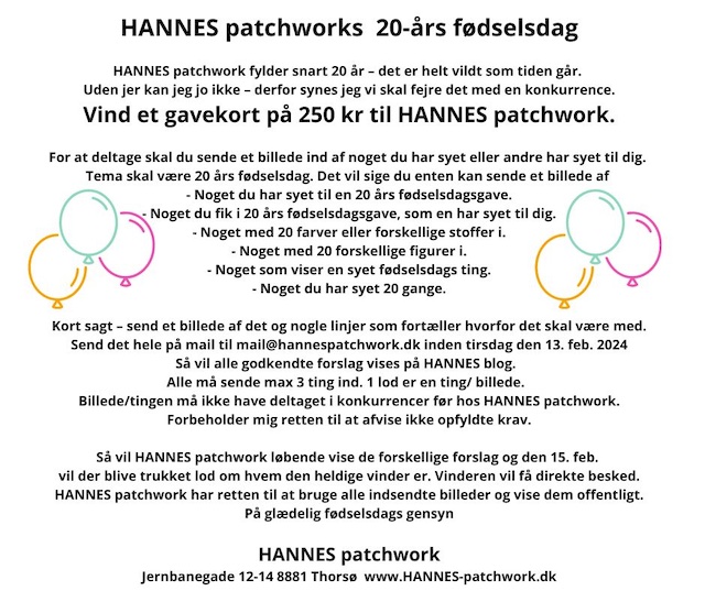 Hos HANNES patchwork går tiden med at gør klar til 20 års fødselsdag.