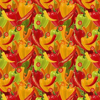 Dette flotte stof har hele chilli og peberfrugter i gule, grønne og orange farver.